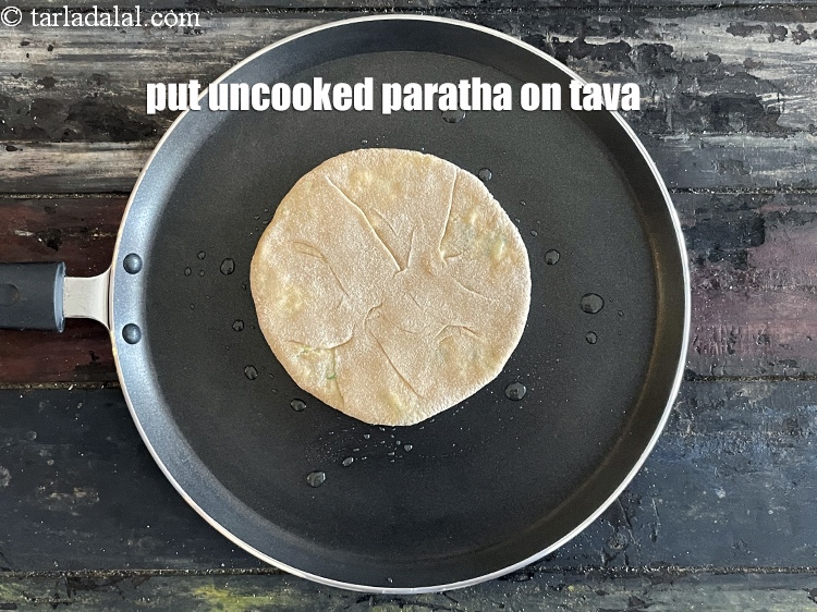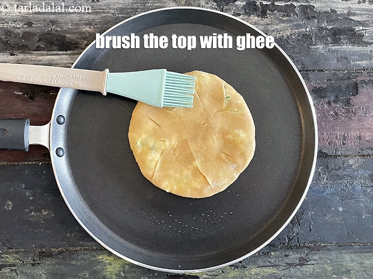 Heat a non-stick tava (griddle) and cook the paratha using a little ghee until golden brown spots appear on both the sides.