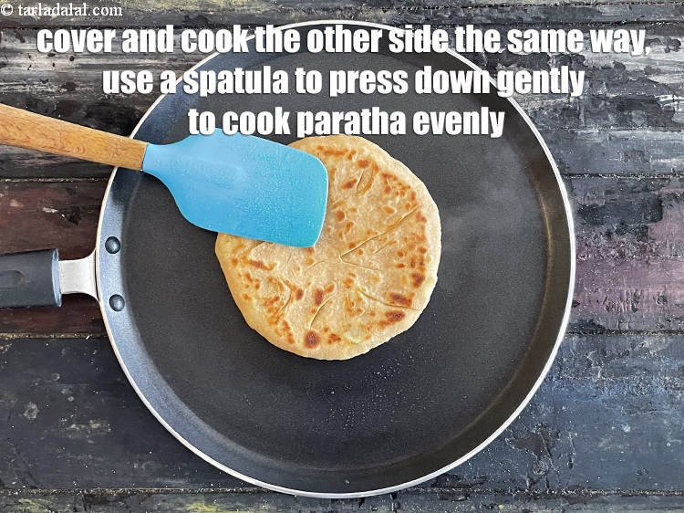 Cook the other side the same way and use a spatula to press down to cook the paratha evenly.