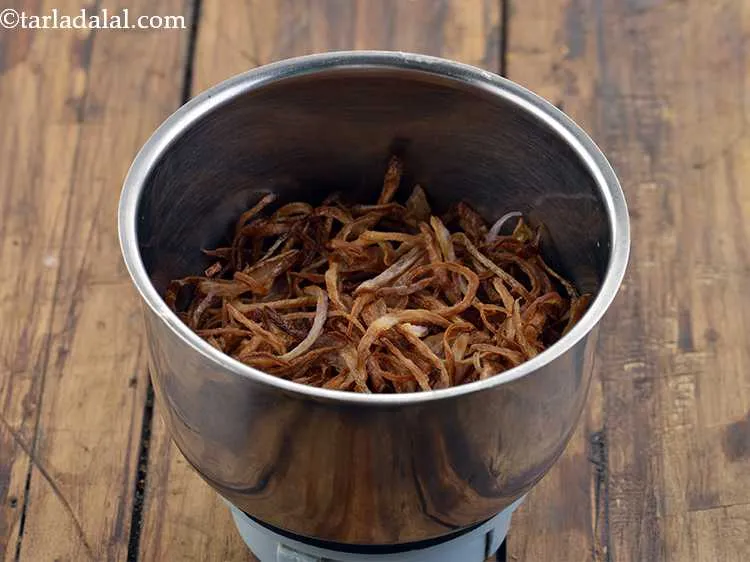 मुलायम होने तक गहरे तले हुए प्याज को मिक्सर में पीस लें। एक तरफ रख दें। यह तले हुए प्याज की पेस्ट है।