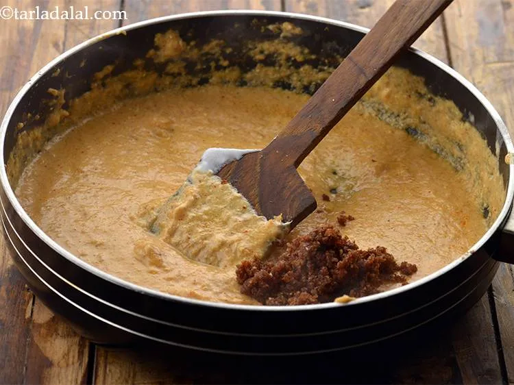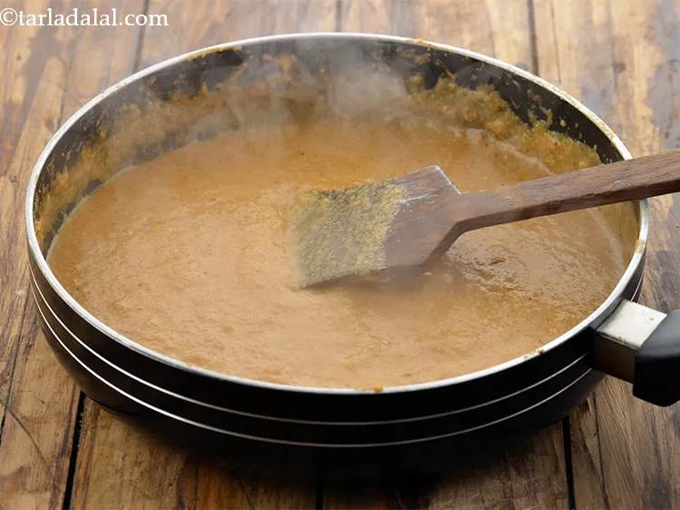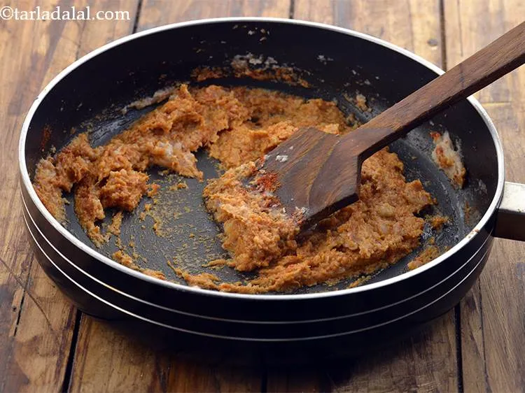 - तले हुए प्याज की पेस्ट, नमक और 1/2 कप पानी डालें, अच्छी तरह मिलाएँ और मध्यम आँच पर 2 मिनट के लिए बीच-बीच में हिलाते हुए पकाएँ।