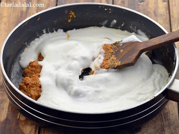 अच्छी तरह से मिलाएं और धीमी आंच पर लगातार हिलाते हुए १ मिनट तक पकाएं। अगर आंच ज्यादा है तो दही कर्डल हो जाएगा इसलिए सुनिश्चित करें कि आप आंच को कम कर दें।