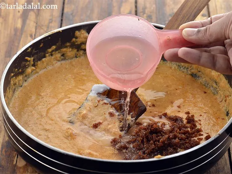 नमक और १/२ कप पानी डालें। ग्रेवी की स्थिरता को समायोजित करने के लिए पानी डाला जाता है।