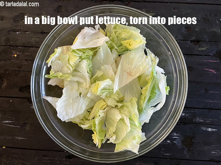 To make paneer tomato lettuce salad recipe | paneer salad for weight loss | green peas, capsicum, celery salad | pregnancy salad | protein, fibre, vitamin b1 rich salad | in a bowl put 2 cups lettuce , torn into pieces.