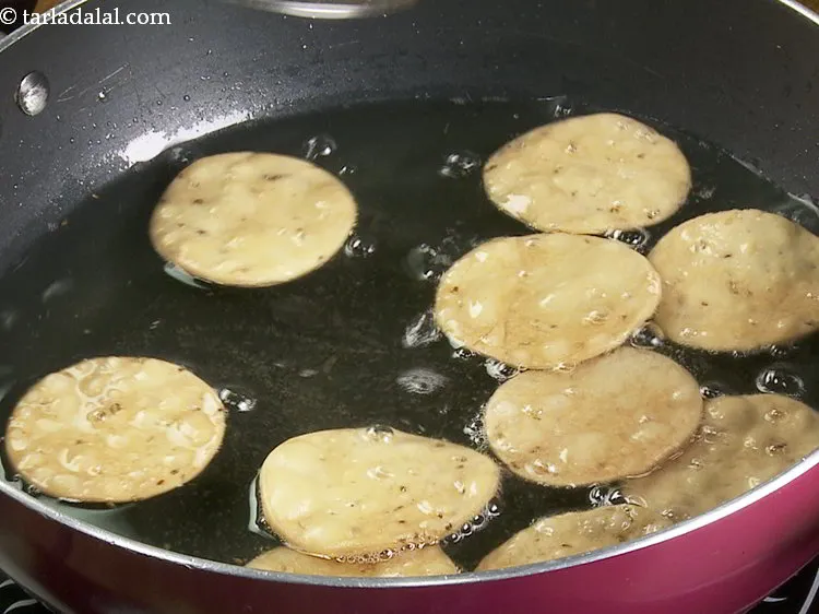 - एक गहरे नॉन-स्टिक पैन में तेल गरम करें और मध्यम आँच पर एक समय में कुछ पापड़ी डालकर दोनों तरफ से सुनहरे भूरे रंग की होने तक तल लें।