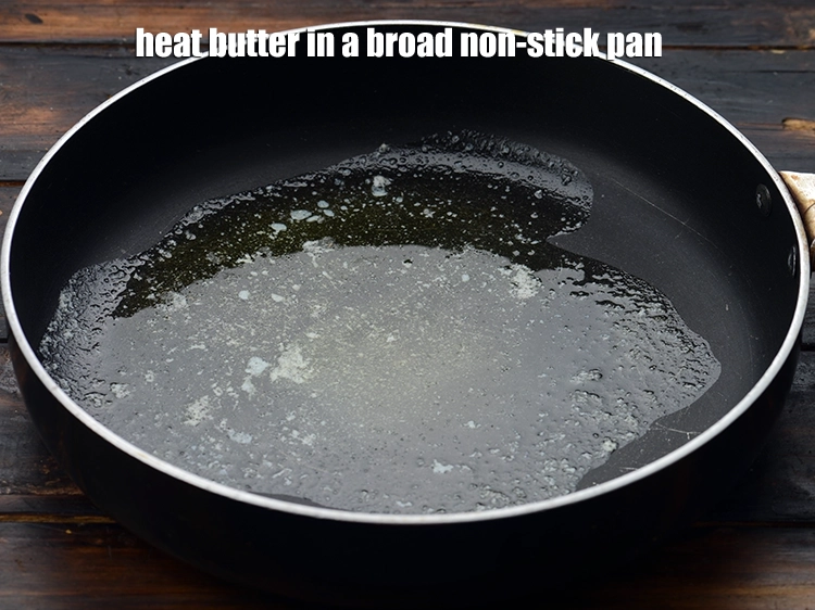 - Heat the butter in a broad non-stick pan, add the garlic and sauté on a medium flame for a few seconds.
