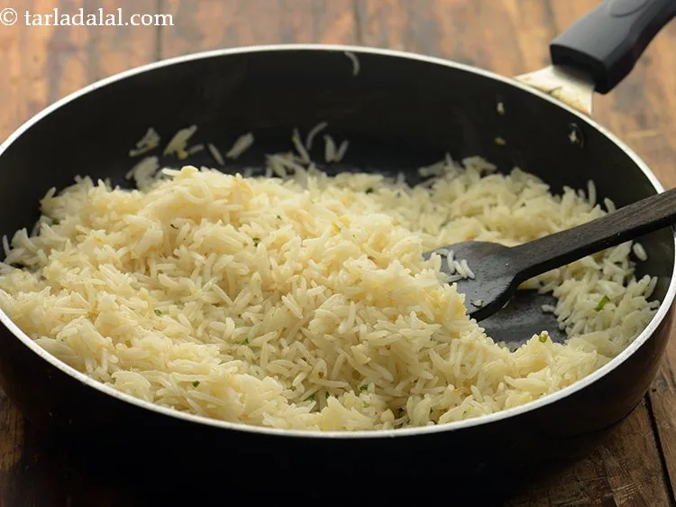 पके हुए बासमती चावल को सपाट सतह या बड़ी प्लेट पर फैलाएं और उसे १ से २ घंटे तक ठंडा होने दें।
