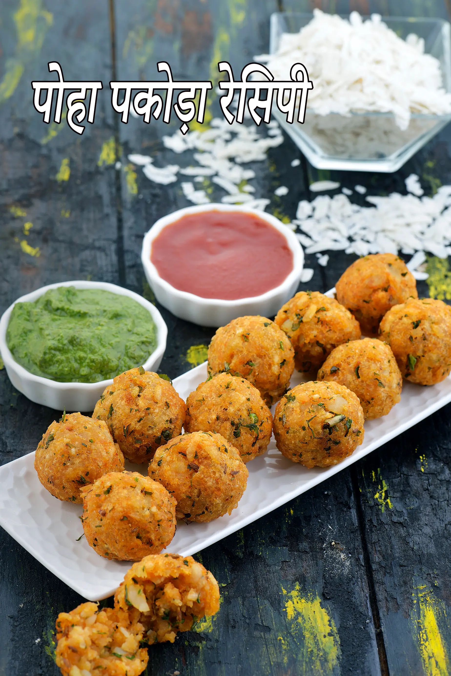- पोहा पकोड़ा को हरी चटनी और टमॅटो कैचप के साथ तुरंत परोसें।