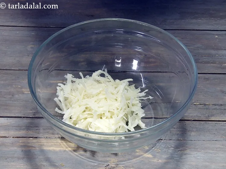 Using a grater, grate the potatoes. Prefer to grate them thickly. Use them immediately as they tend to turn black because of exposure to air. Alternatively, you can keep them in water for some time to avoid blackening.