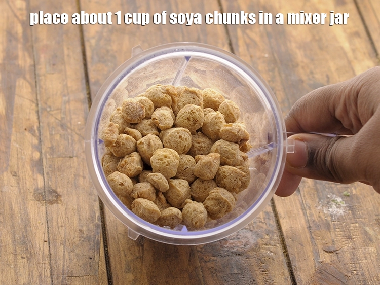 એક મિક્સર જારમાં લગભગ ૧ કપ સોયા ચંક મૂકો. આનાથી તમને ૧/૨ કપ પાઉડર સોયા ચંક મળશે. રેસીપીની માત્રા અનુસાર સોયા ચંક્સને પીસી લો. Place about 1 cup of soya chunks in a mixer jar. This will give you 1/2 cup powdered soya chunks. Grind the soya chunks according to the recipe's quantity.