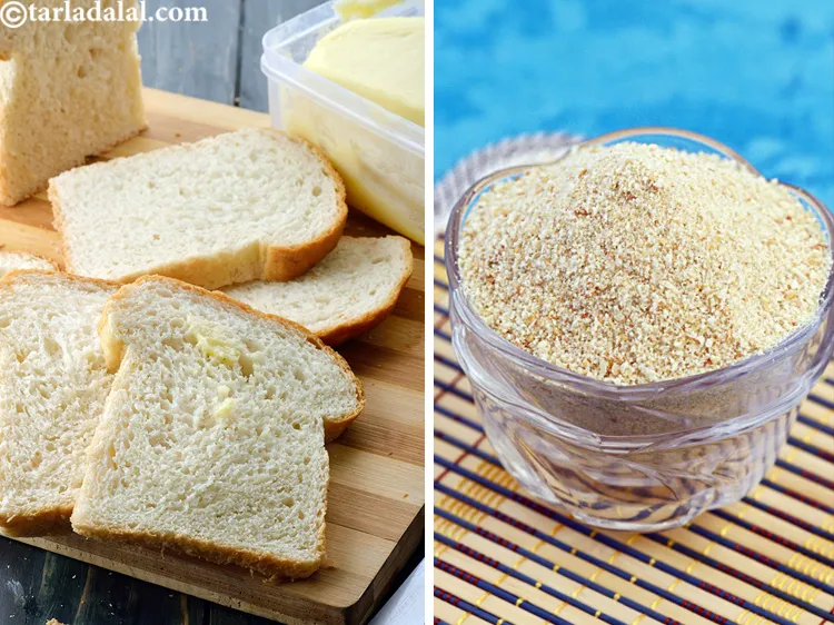 - 1 1/4 कप ताजा ब्रेड क्रम्ब्स बनाने के लिए, मिक्सर में 7 से 8 छोटी ब्रेड स्लाइस को क्रम्बल होने तक पीस लें।