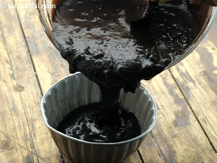 - चॉकलेट के मिश्रण के एक भाग को मक्खन से चुपडे हुए एल्युमिनियम टिन में डालें।