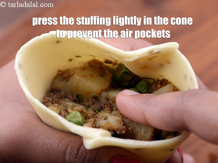 सुनिश्चित करें कि समोसे के किनारों को अच्छी तरह से सील कर दिया गया है ताकि तलते समय स्टफिंग बाहर न निकले।
