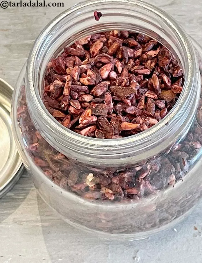 Since we need a small amount, we are going to make small pieces of roasted pomegranate seeds with a mortar and pestle. Put in a mixer and powder them if you are doing a big batch.