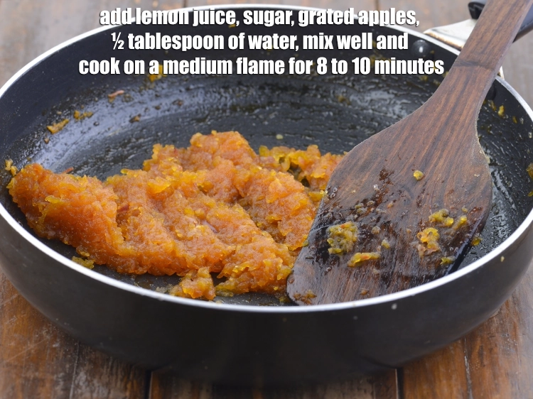 - Add the lemon juice, sugar, grated apples, ½ tablespoon of water, mix well and cook on a medium flame for 8 to 10 minutes, while stirring occasionally.