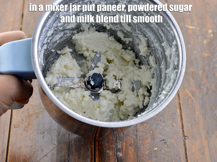 To make the sandesh, in a mixer jar add 1/2 cup chopped paneer (cottage cheese), add 2 tbsp powdered sugar, add 4 tsp milk and blend till smooth.