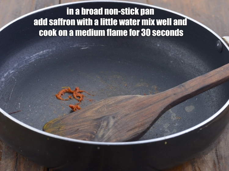 - एक चौड़े नॉन-स्टिक पैन में थोड़े से पानी के साथ केसर डालें, अच्छी तरह मिलाएँ और मध्यम आँच पर ३० सेकंड तक पकाएँ।