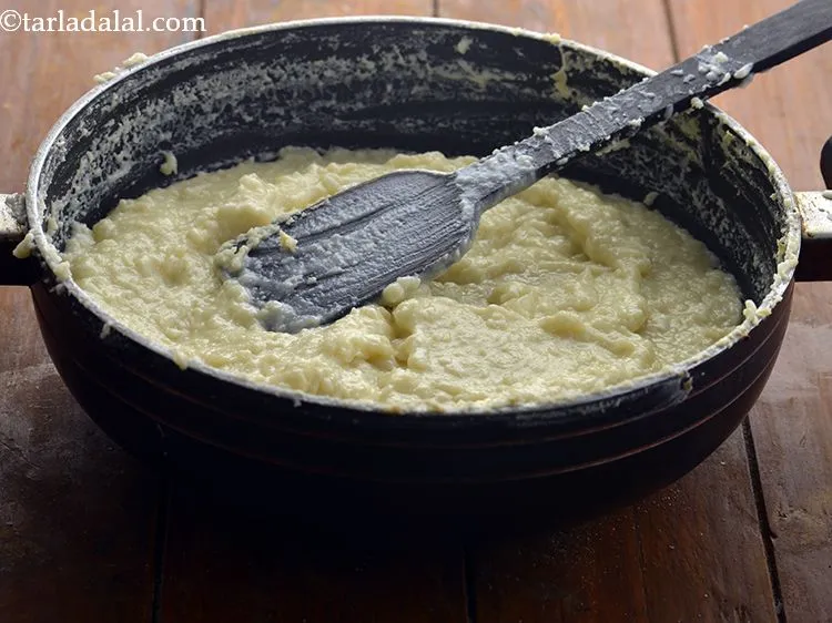- Transfer the mixture immediately into the greased thali.