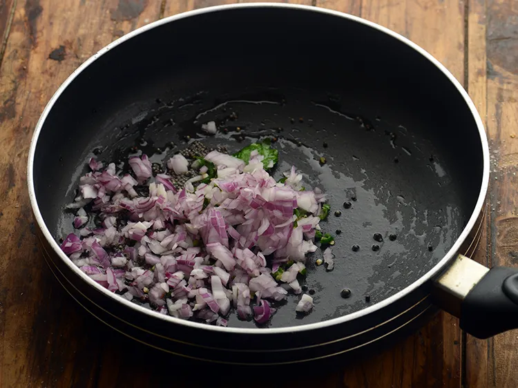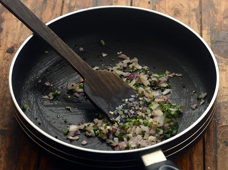 3. When the seeds crackle, add the asafoetida, curry leaves, green chillies and onions and sauté on a medium flame for 1 minute.