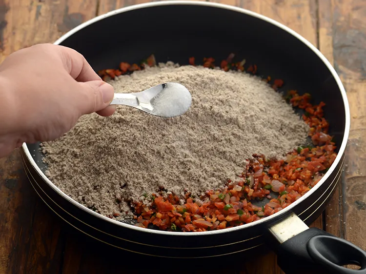 5. Add the roasted ragi- semolina mixture and salt and sauté on a medium flame for 1 to 2 minutes.
