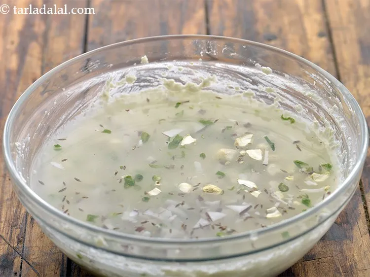 3. Add the green chillies, cumin seeds, coconut, cashewnuts and salt and mix well.