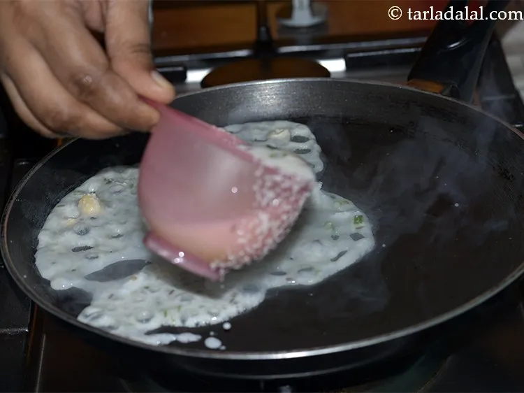 7. Pour ½ cup of the batter and tilt the tava in all directions so that it forms a thin circle.