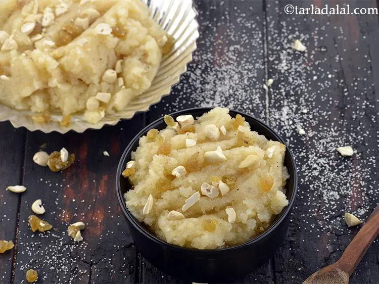 सूजी का हलवा, घी में रवा को भूनकर बनाया जाता है, फिर दूध, पानी, चीनी और मेवे मिलाए जाते हैं और फिर धीमी आंच पर 10 मिनट के लिए पकाया जाता है।