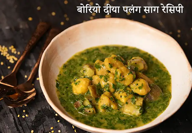 बोरियो दीया पलंग साग रेसिपी | बंगाली पालक, दाल के पकौड़े के साथ बैंगन | पालोंग शाक | बोरियो दीया पलंग साग रेसिपी हिंदी में | borio diya palang saag recipe in hindi | पालक की ग्रेवी में पकाए गए मूंग दाल के पकौड़े की एक क्लासिक बंगाली डिश।
