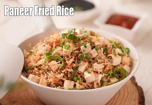 પનીર ફ્રાઇડ રાઇસ એક સ્વાદિષ્ટ ઇન્ડો-ચાઇનીઝ વાનગી છે, જે પકાવેલા ચોખા, નરમ પનીરના ટુકડા અને મિક્સ શાકભાજીથી બનાવવામાં આવે છે। તેમાં લસણ, સ્પ્રિંગ ઑનિયન અને હળવા ચાઇનીઝ સોસ સાથે સ્ટર-ફ્રાય કરવામાં આવે છે। પનીર આ વાનગીને પ્રોટીન અને સમૃદ્ધ સ્વાદ આપે છે। આ રાઇસ પેટ ભરનારું છતાં હલકું હોય છે। તેને સંપૂર્ણ ભોજન અથવા સાઇડ ડિશ તરીકે પીરસી શકાય છે।