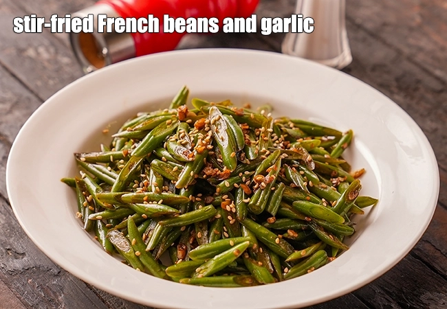 સ્ટિર-ફ્રાયડ ફ્રેન્ચ બીન્સ એક સરળ ચાઇનીઝ શૈલીની વાનગી છે, જેમાં તાજી ફ્રેન્ચ બીન્સને લસણ અને સોસ સાથે ઊંચી આંચ પર ઝડપી રીતે બનાવવામાં આવે છે। ઝડપી રસોઈથી બીન્સ કરકરી અને લીલી રહે છે। તેનો સ્વાદ હળવો પરંતુ સ્વાદિષ્ટ હોય છે। આ વાનગી ઓછી તેલવાળી અને પચવામાં સરળ છે। તે ચોખા અથવા નૂડલ્સ સાથે સાઇડ ડિશ તરીકે સારી લાગે છે।