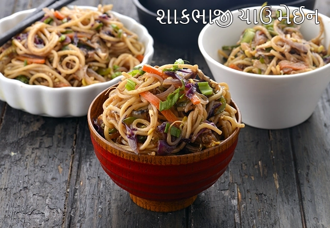ચાઉમિન નૂડલ્સને શાકભાજી સાથે સ્ટર-ફ્રાય કરવામાં આવે છે. આ હળવું મસાલેદાર હોય છે.