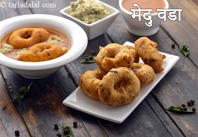 3. मेदु वड़ा बनाने के लिए, उड़द की दाल को भिगोया जाता है, छान लिया जाता है और फिर मसाले डालकर एक चिकना घोल बनाने के लिए ब्लेंड किया जाता है। फिर उड़द दाल वड़ा के छोटे हिस्से को डीप फ्राई किया जाता है।