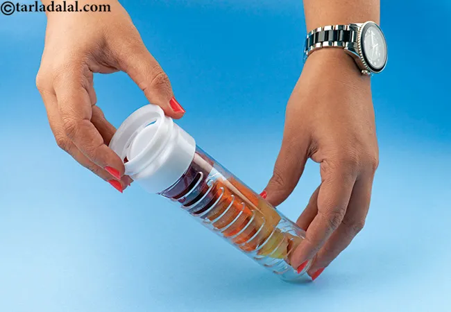 • Place the cut fruits into the infuser tube. Pack the fruits into the infuser tube, layering different types one over the other, so that the water can infuse the full flavour of each fruit. Once the infuser is filled, lid it securely.