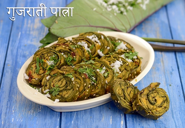 अरबी के पत्तों से बने स्टीम्ड रोल्स, मीठे-तीखे स्वाद के साथ।