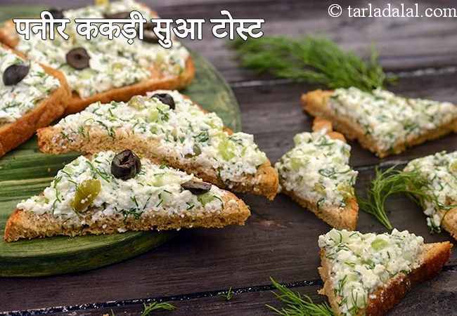 पनीर ककड़ी सुआ टोस्ट रेसिपी | पनीर कुकुम्बर एण्ड दिल टोस्ट | पनीर टोस्ट | paneer cucumber dill toast in hindi | with 19 amazing images. पनीर ककड़ी सुआ टोस्ट रेसिपी | भारतीय पनीर टोस्ट | स्वस्थ पनीर ककड़ी सुवा टोस्ट सभी स्वास्थ्य के प्रति जागरूक लोगों के लिए एक स्वस्थ नाश्ता है। कोई झंझट नहीं, बस मस्ती. . . और बेशक अच्छी सेहत भी! इस झटपट पनीर ककड़ी सुआ टोस्ट में केवल सामग्री को मिलाना और उनके साथ पूरे गेहूं के टोस्ट को टॉप करना शामिल है। जब आपके पास समय हो, तो रेडीमेड होल व्हीट ब्रेड की जगह मल्टीग्रेन ब्रेड का इस्तेमाल करें। आप निश्चित रूप से इसकी बनावट और स्वाद को पसंद करेंगे।