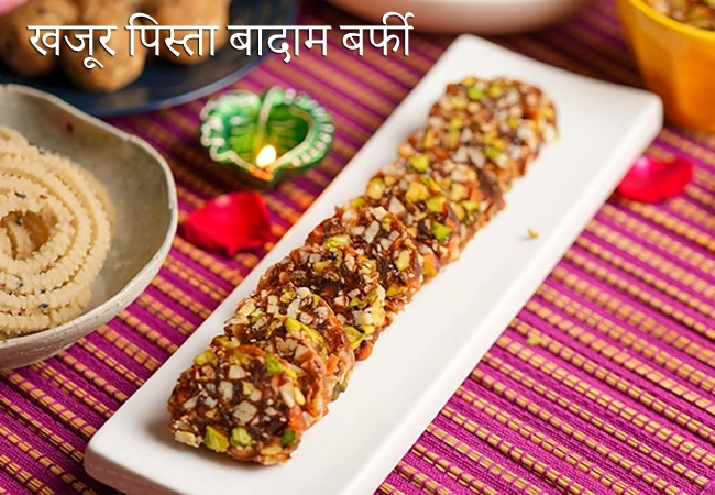खजूर पिस्ता बादाम बर्फी रेसिपी | बिना चीनी खजूर बादाम मिठाई| स्वस्थ चीनी मुक्त भारतीय बर्फी | झटपट मिक्स्ड मेवा बर्फी | खजूर पिस्ता बादाम बर्फी रेसिपी हिंदी में | khajur pista almond barfi recipe in hindi | with 25 amazing images. मेवे बिना चीनी खजूर बादाम मिठाई को प्रोटीन और फाइबर से भरपूर बनाते हैं । ये 2 पोषक तत्व तृप्ति मूल्य जोड़ते हैं। तो आप इस मिठाई को पैक कर सकते हैं और तले हुए और अन्य चीनी युक्त स्नैक्स से दूर रहने के बजाय एक स्वस्थ नाश्ते के रूप में इसका आनंद ले सकते हैं। 2 बर्फी 22% फाइबर (RDA) आरडीए देती है।