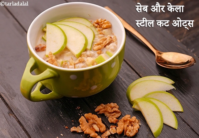 सेब और केले स्टील कट ओट्स | बादाम के दूध के साथ वीगन केला सेब स्टील कट ओटमील | स्वस्थ भारतीय सेब और केला स्टील कट ओट्स | Apple and Banana Steel Cut Oats, Oatmeal