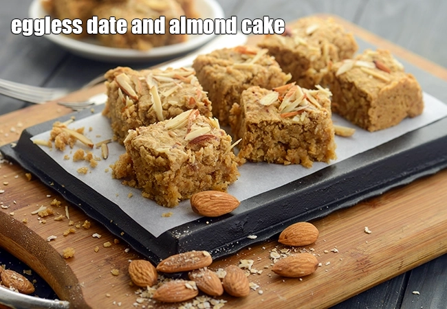 eggless date and almond cake | healthy Indian date almond cake | khajur badam cake recipe | with 28 images. After lots of hard work, we have finally found a healthy Indian date almond cake recipe. To make a cake without plain flour and sugar is not easy. Here in this eggless date and almond cake we have used dates as the sweetener and oats to bind the cake.