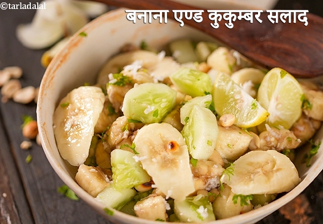 बनाना एण्ड कुकुम्बर सलाद रेसिपी | केला ककड़ी का सलाद | स्वस्थ केला ककड़ी नारियल का सलाद | banana cucumber salad in hindi | केला पोटेशियम और फाइबर का खजाना है। इन पोषक तत्वों से हृदय रोगी लाभान्वित हो सकते हैं। हालांकि, वे कार्ब्स का एक अच्छा स्रोत होने के कारण, हम केवल मधुमेह रोगियों के लिए इस केला ककड़ी का सलाद की सलाह नहीं देते हैं।
