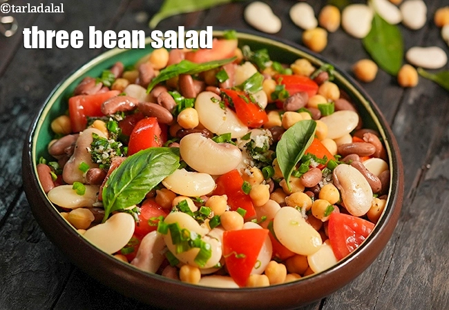 three bean salad recipe | rajma, kabuli chana and rangoon na vaal salad | healthy Indian kidney beans, chick peas and broad field beans salad.