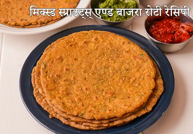 मिक्स्ड स्प्राउट्स् एण्ड बाजरा रोटी रेसिपी एक दैनिक व्यंजन है जिसे आपकी पसंद के किसी भी सब्ज़ी के साथ परोसा जा सकता है। स्प्राउट्स को 'लिविंग फूड' कहा जाता है और ये पोषक तत्वों से भरपूर होते हैं। वे न केवल प्रोटीन से भरपूर होते हैं जो चयापचय को बढ़ावा देते हैं और वजन घटाने में सहायता करते हैं, बल्कि अंकुरित होने की प्रक्रिया उनकी पोषक सामग्री को कई गुना बढ़ा देती है। आगे उन्हें पचाने में भी आसानी होती है। स्प्राउट्स के और फायदे पढ़ें। बाजरे के साथ ये पौष्टिक फलियां एक आदर्श स्प्राउट्स् रोटी वजन कम करने के लिए बनाती हैं जो ८४ कैलोरी, २. ८ ग्राम प्रोटीन और २. ५ ग्राम फाइबर देती हैं।