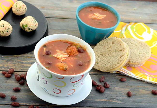 Indian style Mexican tomato soup | Mexican vegetarian tomato soup | Mexican tomato soup with paneer balls | … More..