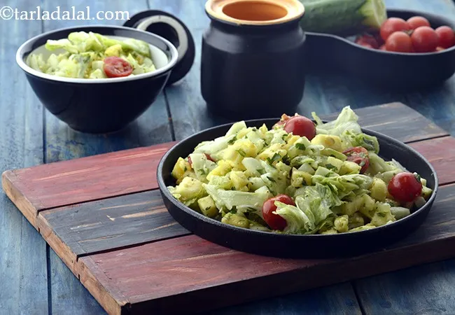 Beetroot and Fruit Salad a delicious combination of cooked beetroot cubes with sweet banana and apple, and tangy orange, pineapple and sweet lime segments, with a crunchy dressing. Apple and Lettuce Salad with Melon Dressing is unique though it may sound, but the melon dressing made with muskmelon puree, cumin seeds, coriander and black pepper is what lends the delicious taste to the fruits in this salad.