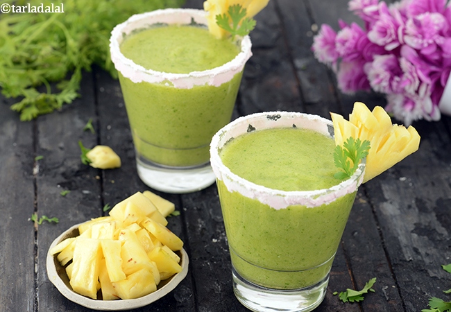 अनानास और धनिए का ज्यूस रेसिपी | भारतीय अनानास अदरक का रस | स्वस्थ अनानस अदरक धनिया का ज्यूस | pineapple and coriander juice recipe | with 11 amazing images. अनानास आयरन का एक समृद्ध स्रोत है, जो सामान्य रक्त परिसंचरण को बनाए रखने और हमारी कोशिकाओं को ऑक्सीजन की आपूर्ति करने के लिए बहुत आवश्यक है। यह शरीर की जीवन शक्ति को बढ़ाने और एनीमिया को रोकने में मदद करता है। अपनी भूख को शांत करने और आपको ऊर्जावान बनाए रखने के लिए इस स्वस्थ अनानस अदरक धनिया का ज्यूस के साथ कुछ स्वस्थ जार स्नैक्स का सेवन करें। एक गिलास अनानास और धनिये के रस में 24% आरडीए आयरन होता है।
