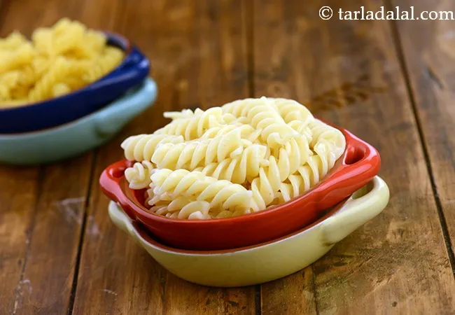 Very small pasta (like macaroni, fusilli, conchiglie, penne) may cook in 5 minutes, while larger shapes (like spaghetti, fettuccine, dried lasagne sheets) may require 10 minutes. Immediately drain the cooked pasta into a sieve or a colander. Transfer to a bowl of cold water to refresh it which stops the cooking process. Also, if you are not using them immediately then drizzle some oil and toss gently.