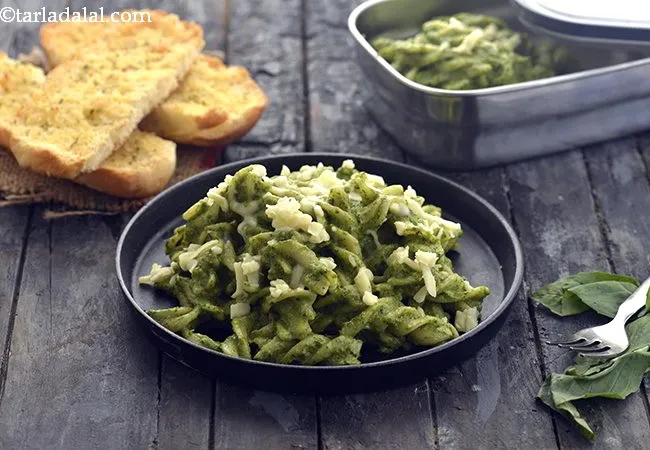 Another famous pasta which is found on most restaurant menus is creamy pesto pasta. Pesto, a sauce made of nuts and herbs is made richer here by the addition of spinach, which gives it a vibrant colour, unique flavour and creamier texture too. Along with olive oil and cheese, it makes a great home for perfectly cooked fusilli in vegetarian creamy pesto pasta.