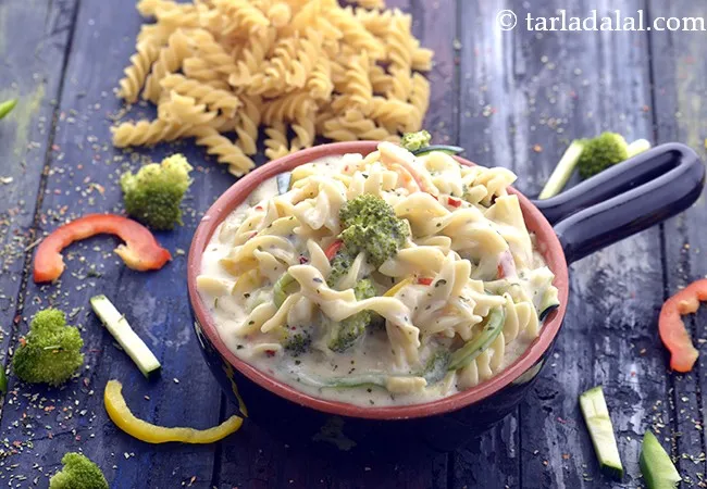 Are you a health conscious looking for some healthy pasta recipe? Dig in to whole wheat pasta in low calorie white sauce. Satiating and delicious, the penne in white sauce is an exciting meal in a bowl. Full of veggies and whole wheat pasta, this dish is a power-packed and fibre-filled treat that helps reduce bad cholesterol. The colourful veggies, apart from adding visual appeal and a lovely crunch to the dish, also pool in ample nutrients. Weight watchers, heart patients and diabetics can enjoy this pasta in small quantities occasionally.