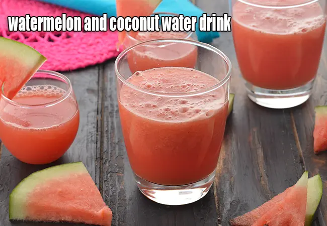 watermelon and coconut water drink recipe | heart friendly and lower blood pressure drink | healthy Indian watermelon coconut water drink | Watermelon is a cooling fruit, which is made even better by the addition of coconut water in this heart-friendly and lower blood pressure drink, which is effective in balancing the stomach acids. Watermelon is low in calories and full of water, thus is good for weight loss too. Citrulline in watermelon has been studied for its effect on heart function and it was revealed that it improves heart function and helps in the treatment of heart failure.