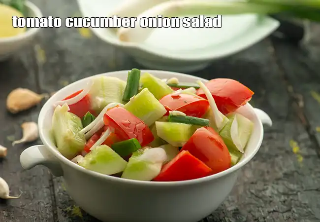 2. Tomato Cucumber and Onion Salad is a quick recipe with a mind-blowing crunch. This Healthy Kachumber Salad has a slightly spicy lemony dressing, which is the highlight of this recipe. While most kachumber have finely chopped veggies, in this salad we have cut the veggies into cubes for a slightly better mouthfeel. learn How to make Onion Tomato Cucumber Salad at Home.