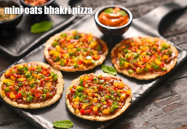 mini oats bhakri pizza recipe | healthy oats pizza | oats flour pizza no eggs | Indian style bhakri pizza