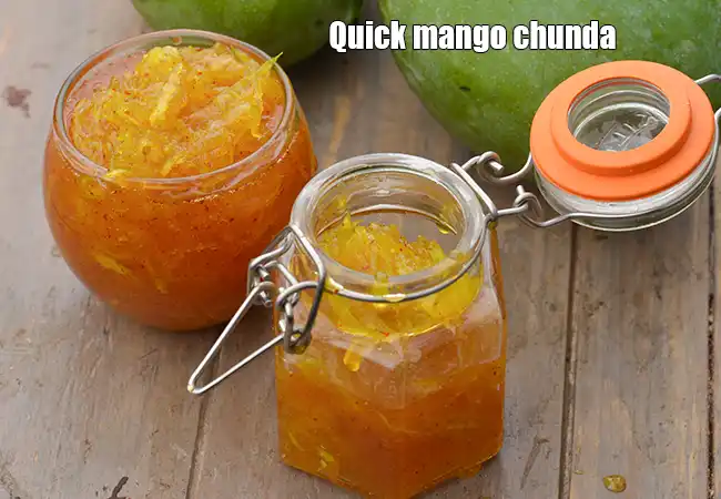 Grated raw mango cooked with sugar.